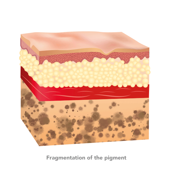 Fragmentation of the pigment in small particles (less than 6 microns) to facilitate elimination through phagocytosis via lymphatics. Chemical alteration of the pigment it less visible to the human eye. Pigment can be decreased to some extent by the trans epidermal elimination.
